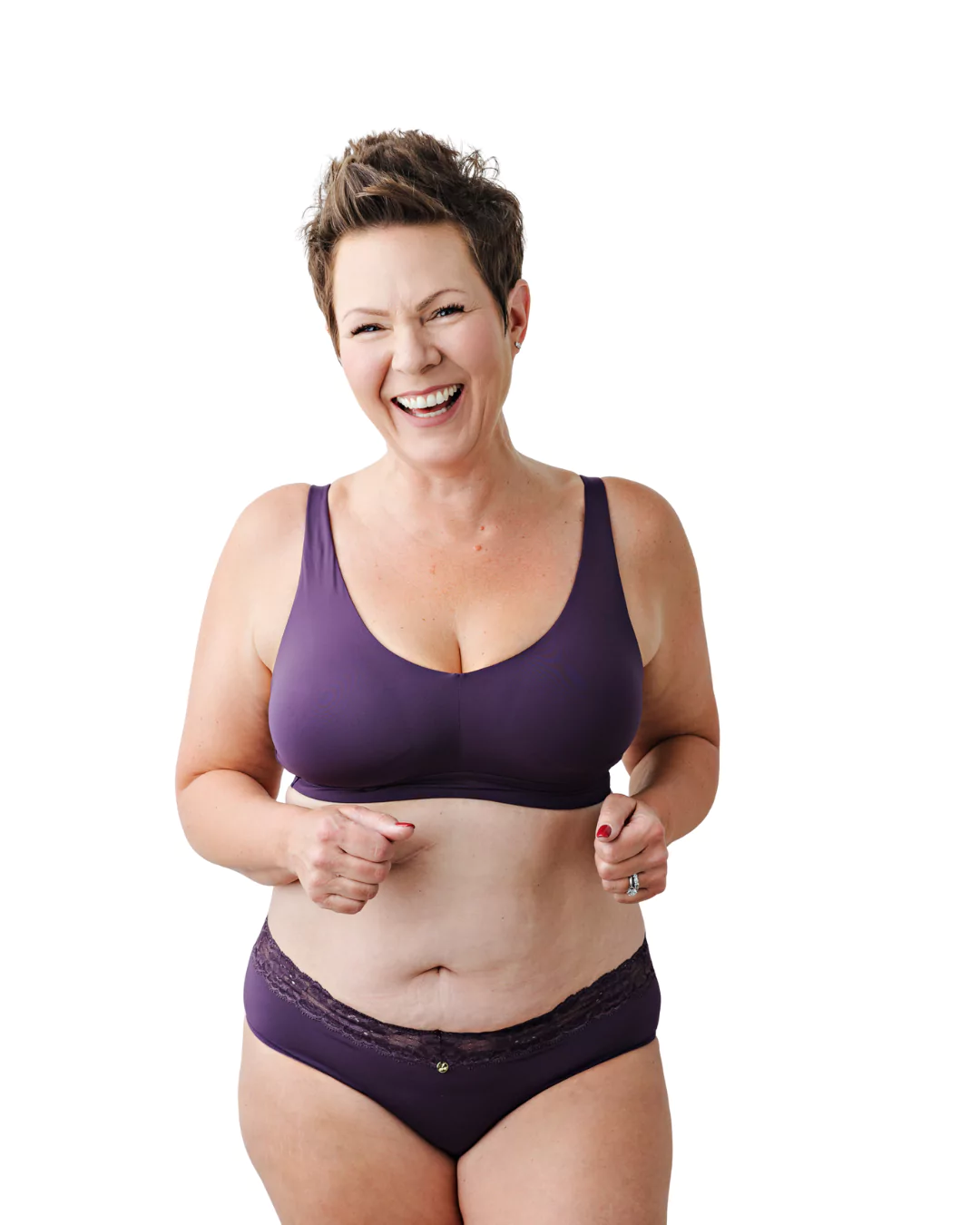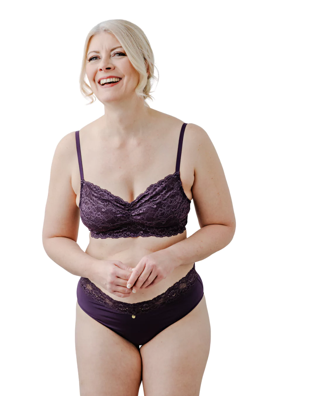 Pretty and supportive, Gabby is a wireless bralette designed for fuller busts. Convertible straps and stretch lace provide comfort, shape, and versatility—great for lounging, sleep, or daily wear.